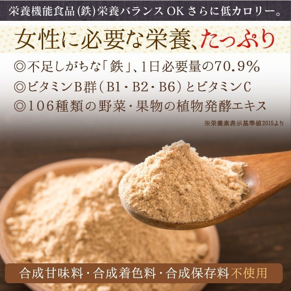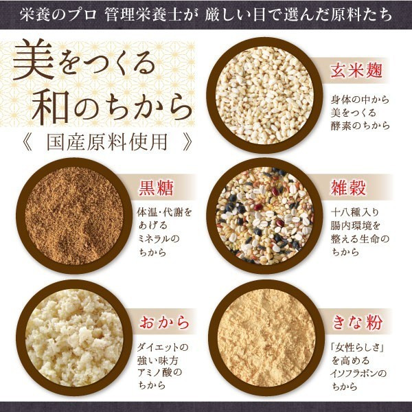 本商品には、玄米麹をはじめ、雑穀・黒糖・きな粉・おからパウダーなど、和の素材がバランスよく配合されています。さらに、106種類の野菜や果物から抽出された発酵エキスを加えることで、日々の食事では補いきれない栄養素をサポートします。発酵素材を取り入れることで、内側から整える意識を持ちやすくなる点も特徴です。