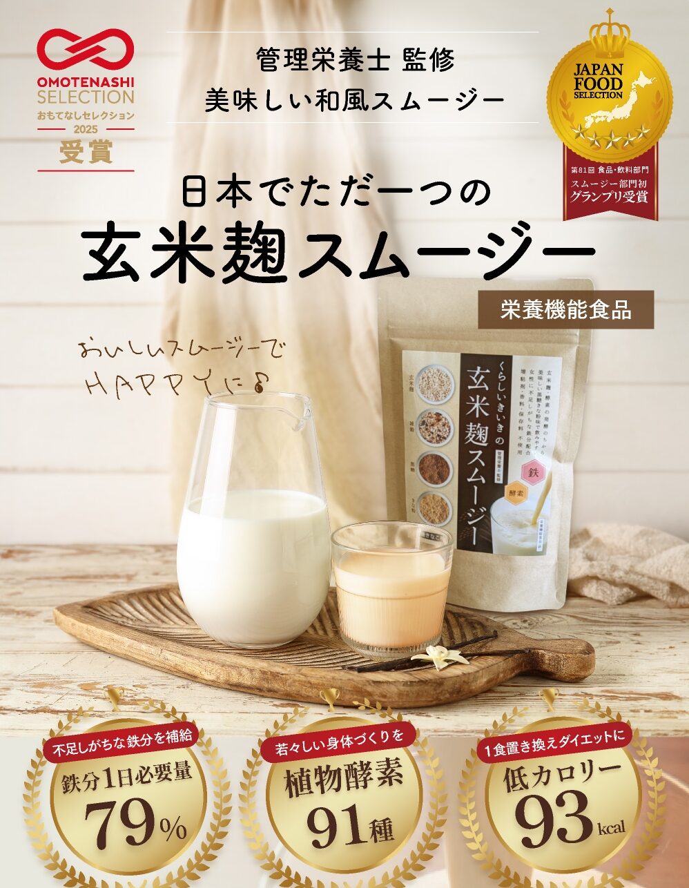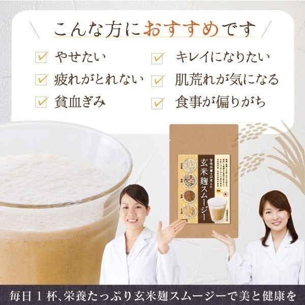 『玄米麹スムージー』は、管理栄養士が考案した、玄米麹を使用した和のスムージーです。日本の伝統的な発酵素材を取り入れながら、現代人の食生活に合わせて設計されており、手軽に栄養バランスを意識したい方に向けた商品です。