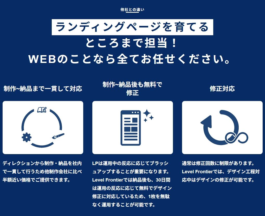 『Level Frontier』は、低コストとクオリティのバランスを重視したランディングページ制作サービスです。初めての方でも依頼しやすく、長く活用できるページ作りをサポートします。これからWeb集客を始めたい方にとって、検討しやすい選択肢といえるでしょう。